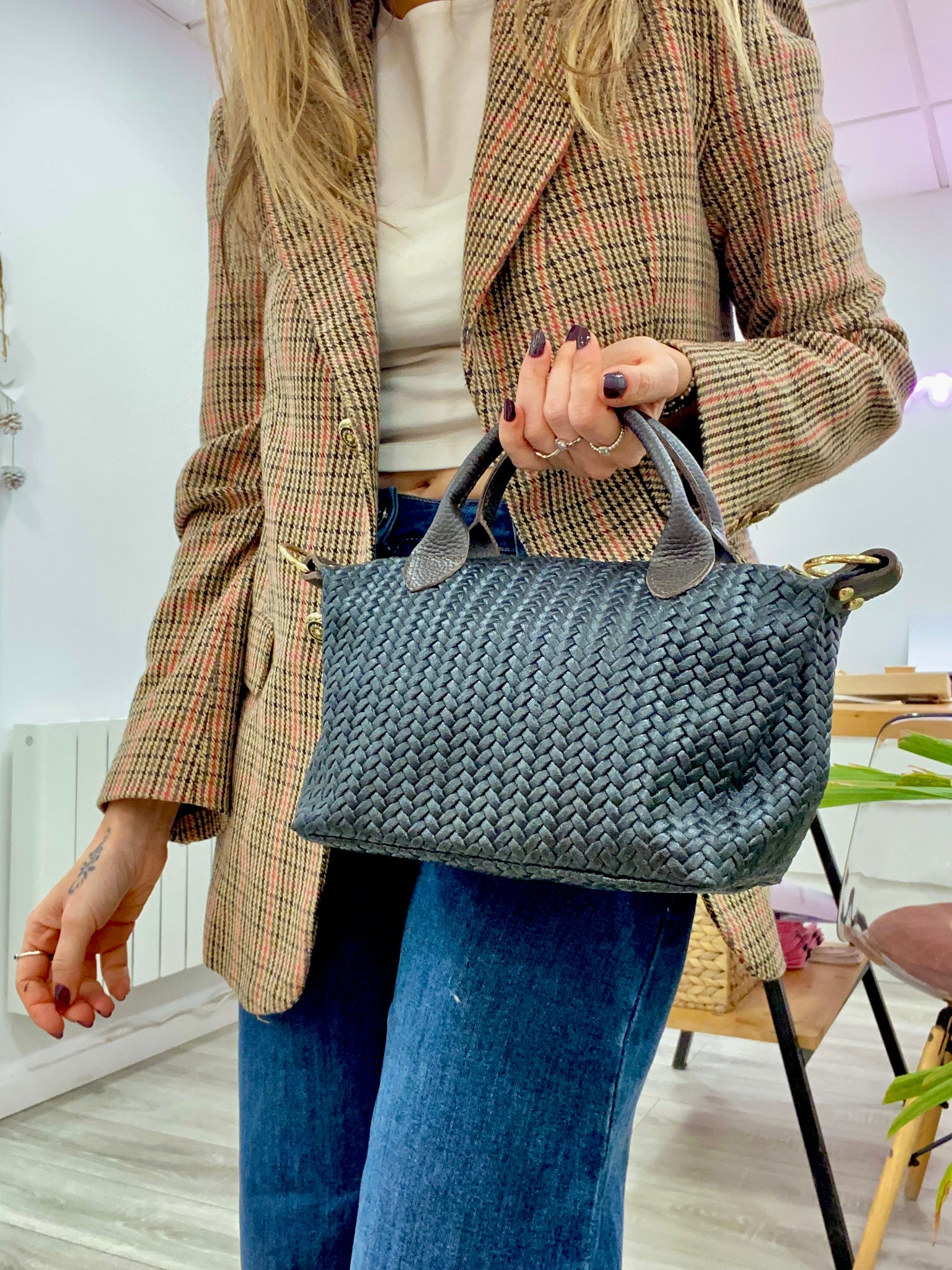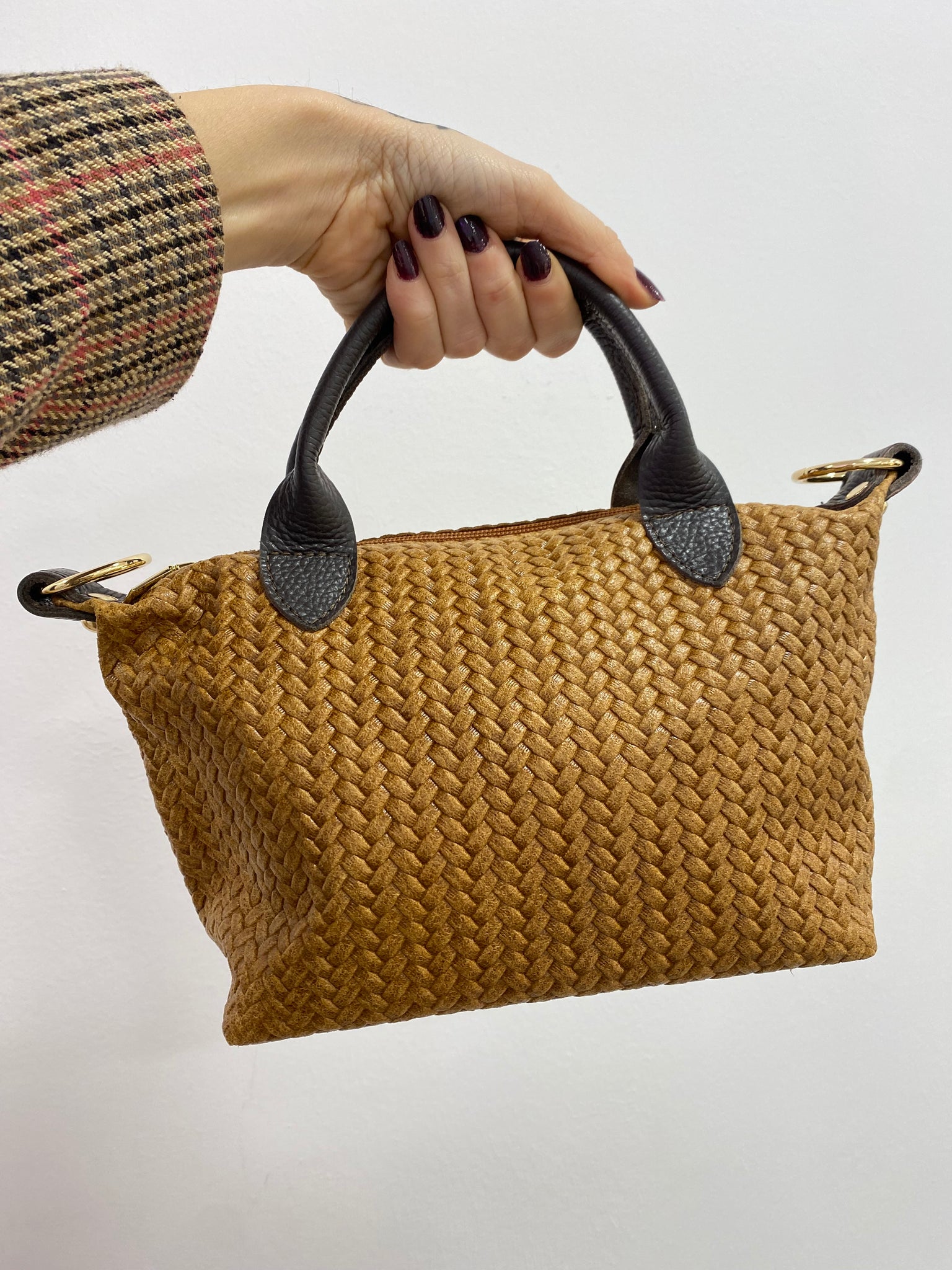Esta hecho en piel trenzada. Incorpora asa pequeño para llevar de mano o a medio brazo, y correa ajustable y extraíble para llevarlo tipo bandolera.