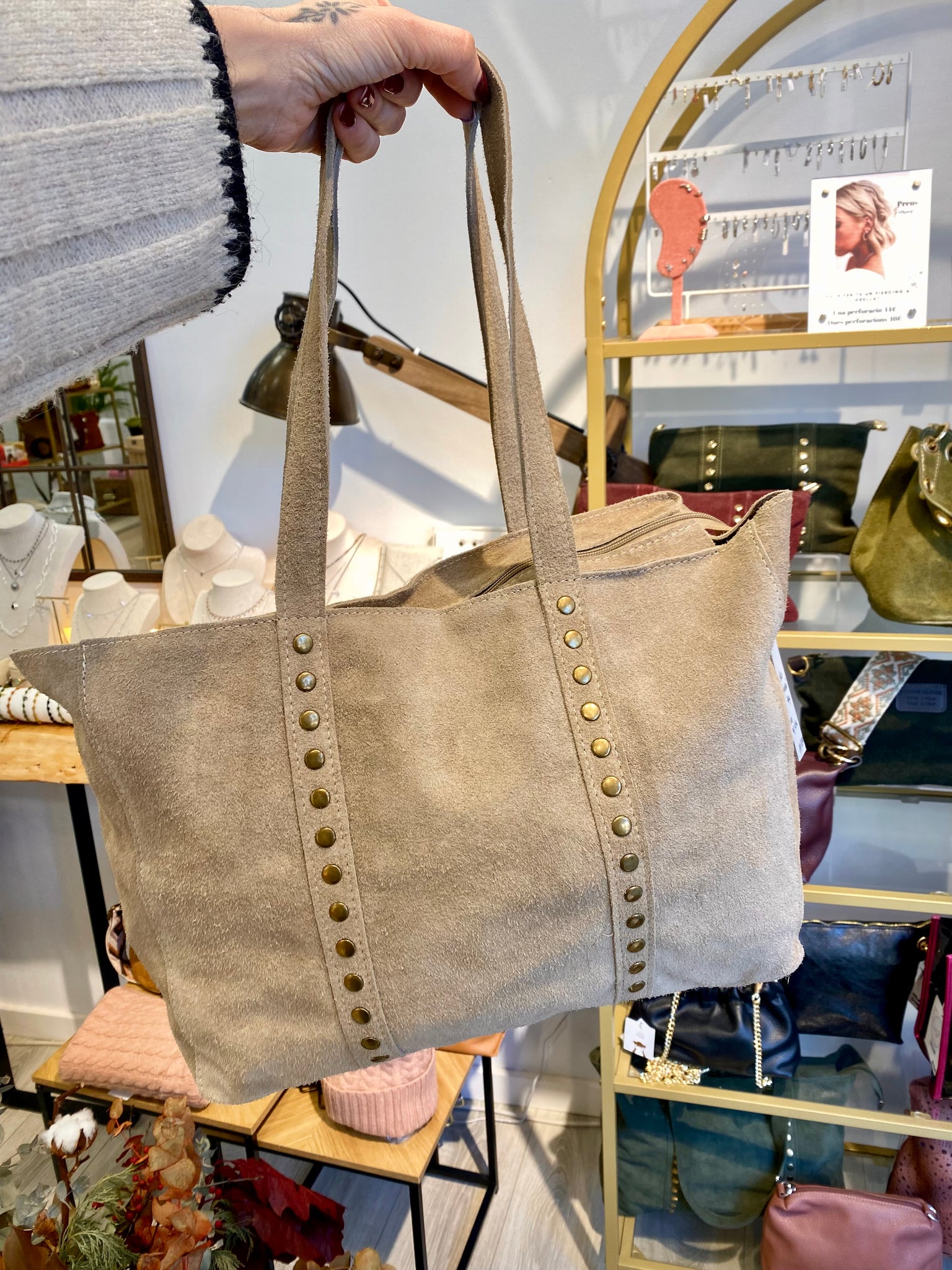 Está fabricado en piel ante con dos franjas laterales de tachuelas en dorado viejo.