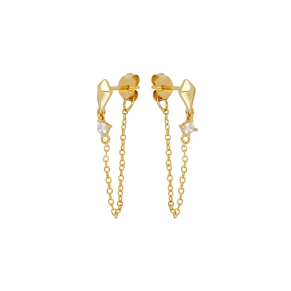 Pendiente doble unidos por una cadenita disponible en plata de primera ley y plata 925 bañada en oro.